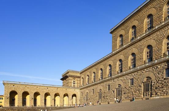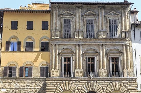 Der Florentiner Renaissancepalast schlechthin. Nicht weniger als fünfzehn Häuser mussten weichen, damit dieser Palast aus grob behauenen Steinen in seiner dominierenden Lage gebaut werden konnte. Baubeginn war 1489 unter Benedetto da Maiano, beendet wurde er 1536 durch Simone del Pollaiuolo, genannt Cronaca. Er führte auch den weitläufigen, arkadengeschmückten Innenhof aus. Beeindruckend ist aber auch das Innere des Palasts: Heute werden hier hochkarätige Kunstausstellungen gezeigt. 2016 gab es beispielsweise u. a. Ausstellungen der Guggenheim-Sammlung und des chinesischen Konzeptkünstlers Ai Weiwei.