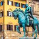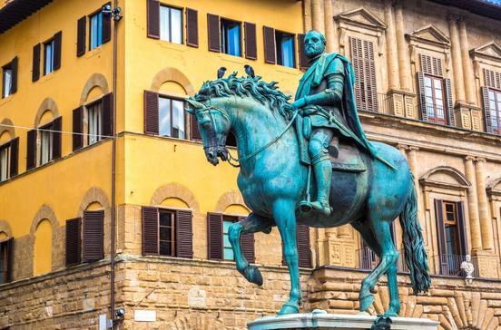 Ein aus Bronze gegossenes Reiterstandbild des berühmten Cosimos I. de'Medici, das vom Künstler Giambologna 1594 enthüllt wurde und noch heute die Piazza della Signorina in Florenz schmückt.