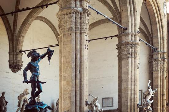 Mit ihren drei herrlichen Rundbögen ist sie ein herausragendes Beispiel der Florentiner Gotik. Zwei Skulpturengruppen ließ Cosimo I. in der Loggia aufstellen, die dem Triumph der Machtherrschaft über die Demokratie Ausdruck verleihen sollten: Das bronzene Meisterwerk des Perseus (1545-54) von Benvenuto Cellini steht in neuem Glanz am alten Platz. Der Marmorsockel ist eine Kopie, das Original befindet sich im Museo Nazionale del Bargello. Die manieristisch gedrehten Figuren des Raub der Sabinerinnen rechts davon stammt von Giambologna (1583). Weitere Skulpturen, darunter sechs römische Frauenstatuen an der Rückwand, vervollständigen die Freiluftgalerie. Errichtet wurde die Loggia schon 1376-82 für Empfänge und zeremonielle Anlässe der Stadtverwaltung, vermutlich von Orcagna. Der Name Loggia dei Lanzi bürgerte sich ein, als Cosimo I. hier seine Söldnertruppe, die lanzichenecchi (Landsknechte), unterbrachte. Auf ihrem Dach wurde 1583 ein damals berühmter hängender Garten angelegt, heute befindet sich dort ein von den Uffizien zugängliches Café mit bester Aussicht über den Platz.