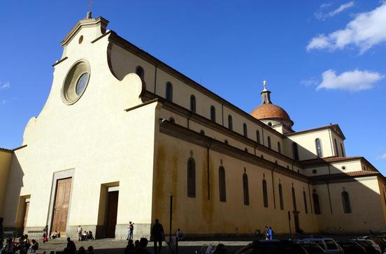 Kein Stein in dieser Kirche, der nicht irgendwie an eine Persönlichkeit aus dem Hause der Medici erinnert. Giovanni di Bicci de’ Medici, der Stammvater, beauftragte Brunelleschi um 1420 mit der Erweiterung des frühchristlichen Gotteshauses, das schon 393 dem hl. Lorenz geweiht worden war. Brunelleschi beendete 1428 zunächst die Alte Sakristei (Sagrestia Vecchia), den ersten Zentralraum der Renaissance. Cosimo der Ältere, Giovannis Sohn, führte dann den Bau der Kirche bis zu ihrer Vollendung 1446 weiter. Er liegt in der Krypta begraben. Eine vielfarbige, runde Steinplatte vor dem Hauptaltar markiert die Stelle. Neben seinem Freund und Mäzen Cosimo Il Vecchio fand Donatello seine letzte Ruhestätte. Zur endgültigen Umwandlung des Kirchenkomplexes in ein großes Mausoleum, den Cappelle Medicee, trug Papst Leo X., Urenkel Cosimos, entscheidend bei, als er Michelangelo mit dem Bau der Neuen Sakristei (Sagrestia Nuova) beauftragte. In den Medici-Kapellen stehen die bedeutenden Grabmäler für Lorenzo Il Magnifico, seinen Bruder Giuliano und deren Nachkömmlinge Giuliano, Herzog von Nemours, sowie Lorenzo, Herzog von Urbino – alle ebenfalls aus der Hand Michelangelos. Mit dem Bau der angrenzenden und vollständig mit Halbedelsteinen ausgekleideten Fürstenkapelle, der Cappella dei Principi, fand zu Beginn des 17.Jhs. die Verherrlichung der Herrscherfamilie ihren gloriosen Abschluss. Zum Kreuzgang und der Biblioteca Medicea Laurenziana gelangt man durch eine Tür links neben dem Kirchenportal. Es gab Ausschreibungen für die Gestaltung der Rohsteinfassade, auch Pläne von Michelangelo liegen vor, wurden aber nie ausgeführt.