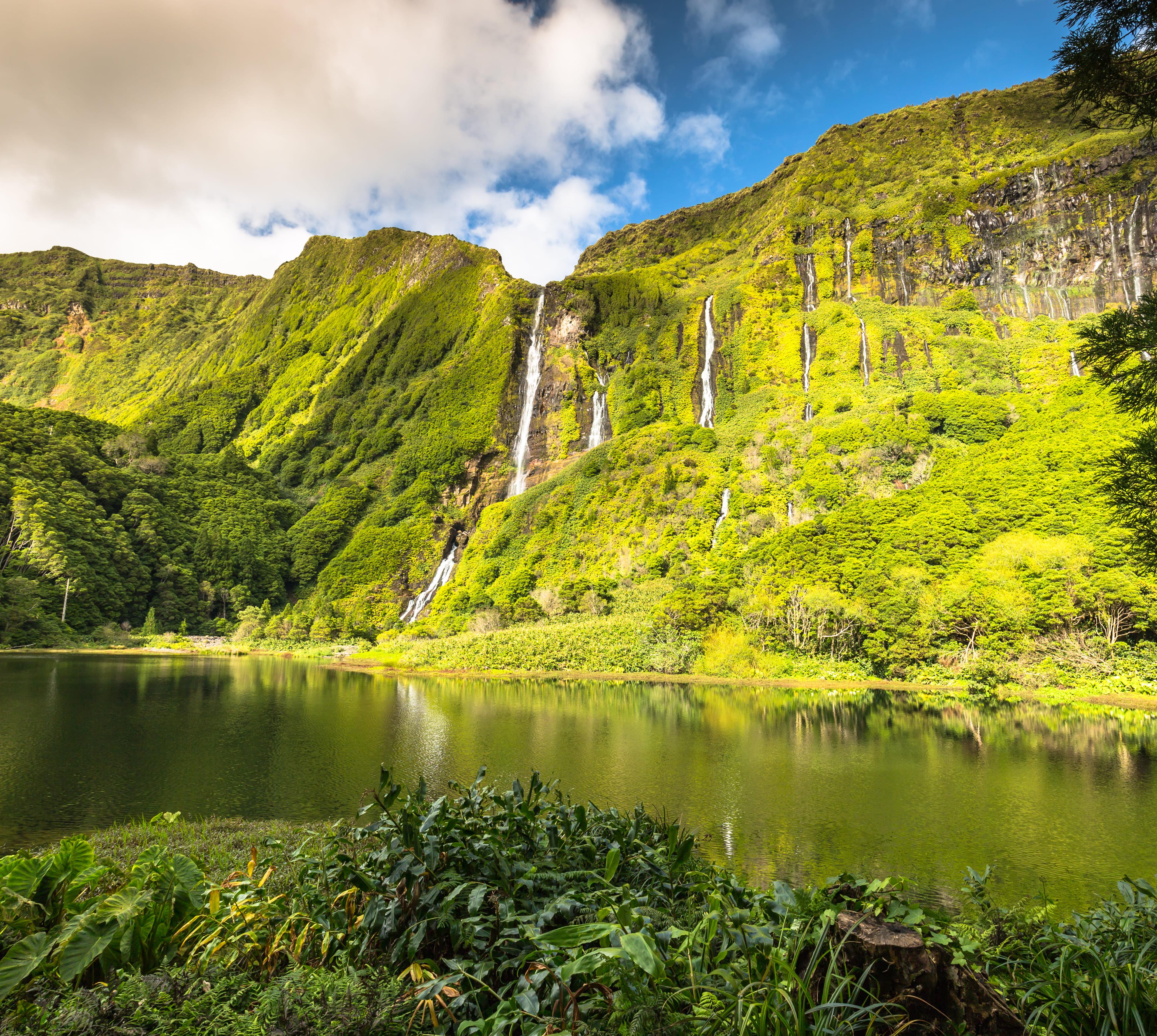 Auf Flores regnet es im Jahresdurchschnitt doppelt so viel wie auf Santa Maria, doch dafür bekommst du auch ein saftiges Naturspektakel geboten: grüne und blühende Berg- und Küstenlandschaften, einsame Kraterseen, tief eingeschnittene Täler – ein Wanderparadies! Die beiden größeren Orte haben wenig Reiz, die abgelegenen Dörfer dafür umso mehr.
