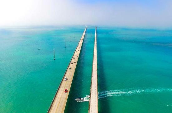 Der Overseas Highway, mit über 40 Brücken, darunter die 11 km lange Seven Mile Bridge, ermöglicht die Autofahrt über das offene Meer.