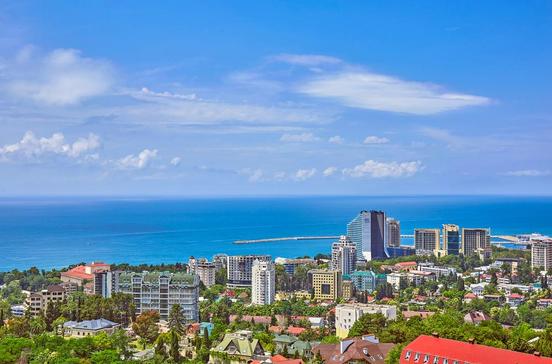 Die „südliche Perle Russlands“ wird Sotschi genannt. Die Stadt (400 000 Ew.) hat sich seit Anfang des letzten Jahrhunderts, als die schwefelwasserstoffhaltigen Mineralquellen wegen ihrer Heilwirkung berühmt wurden, einen internationalen Ruf erworben. Für die Russen und ihre Nachbarn ist Sotschi mit der Region Groß-Sotschi (145 km entlang der Schwarzmeerküste) das Ferienzentrum Nummer eins: In den Kurorten Adler (hier ist auch der Flugplatz), Asche, Chosta, Dagomys, Mamaika und Mazesta verbringen jährlich über 3 Mio.Menschen ihren Urlaub. Die Weite des Strandes und das Hinterland lassen dabei keine Enge aufkommen. Das Klima ist subtropisch geprägt. Im Sommer liegen die Temperaturen bei rund 22 Grad, am Abend weht eine kühle Brise. Gegen die Winde aus dem Norden schützt der Kaukasus. Badesaison istMai bis Ende Oktober. Die Kurorte empfangen aber das ganze Jahr über Gäste. Dem Wasser des Schwarzen Meeres werden Heilwirkungen zugeschrieben. Sotschi selbst ist ein einziger Park, über 80 Prozent des Stadtgebiets sind fast das ganze Jahr über grün. Sotschi bereitet sich gemeinsam mit Krasnaja Poljana im Hinterland auf die Winterolympiade 2014 vor, seither hat ein Bauboom eingesetzt, auch die Grundstückspreise sind rapide gestiegen.
