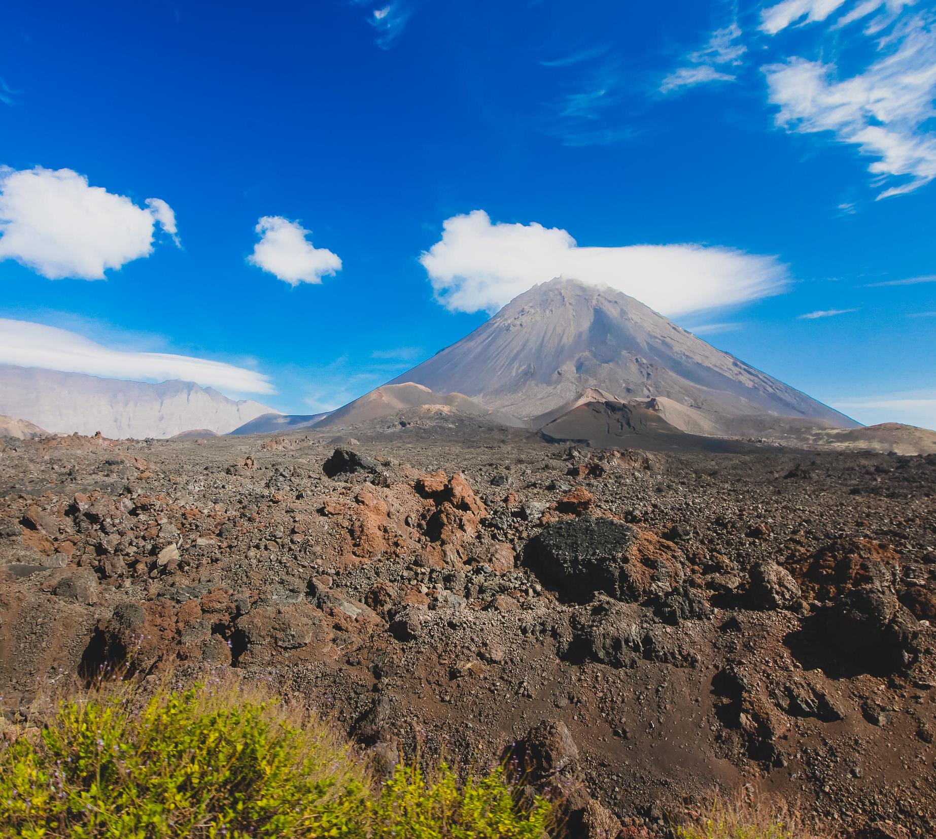 Der Name sagt es schon: Auf der Insel Fogo (portugiesisch „Feuer“) schlummert ein aktiver Vulkan. Die ganze Insel ist ein perfekt geformter Kegel – knapp 3000 m hoch, misst er 25 km Durchmesser an der Basis und 9 km oben am Einsturzkrater, der Chã das Caldeiras.