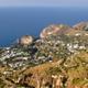 Der Blick schweift von der zerklüfteten Landzunge Zaro mit der Spitze Punta Caruso im Norden über die weiten Strände San Francesco und Chiaia, den Hafen Forios, bis nach Süden zur Citara- Bucht mit der ins Meer ragenden Felskuppe Punta Imperatore.