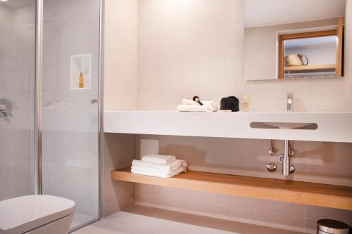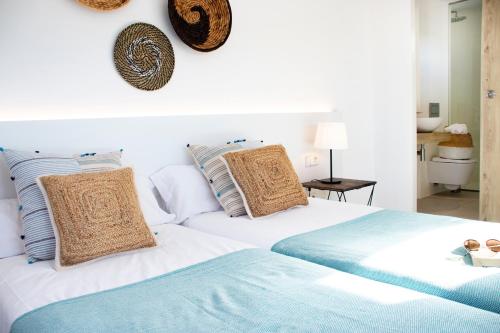 Alle Zimmer im Hotel Es Marès verfügen über ein elegantes, komplett weißes Design und dekorative Details, die vom Strand inspiriert sind. Jedes verfügt über einen Deckenventilator und ein modernes Bad.