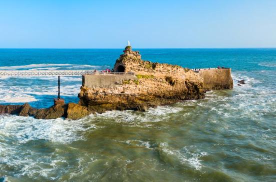 Umgeben vom azurblauen Atlantik sticht das Wahrzeichen von Biarritz, der Jungfrauenfels seiner Marienstatue, auf einer Landzunge in den Himmel. Über eine von Gustave Eiffel entworfene Eisenbrücke gelangt man, sicher vor den tosenden Brandung, zur weißen Gestalt hinüber.