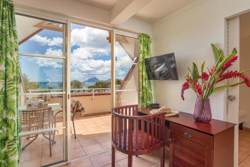 Antikes Mobiliar im schönen Kreolstil schmückt jedes Zimmer des Frégate Bleue Hotels. Hier genießen Sie den Blick aufs Meer. Eine Küchenzeile und eine Klimaanlage stehen zu Ihrer Verfügung.