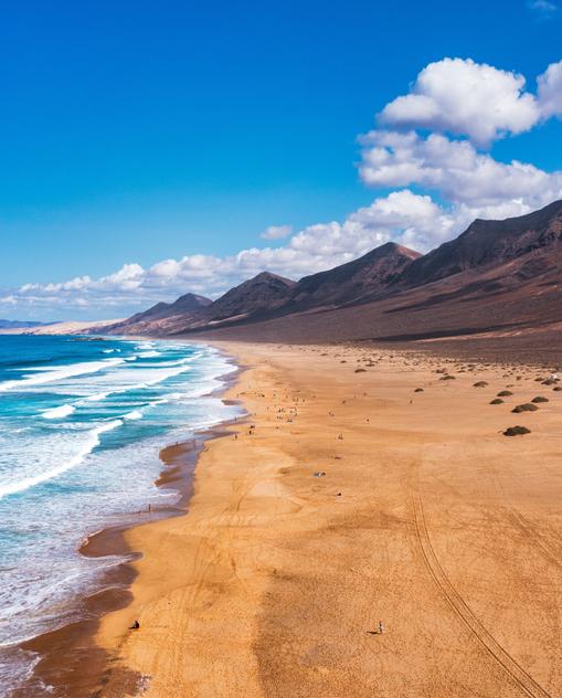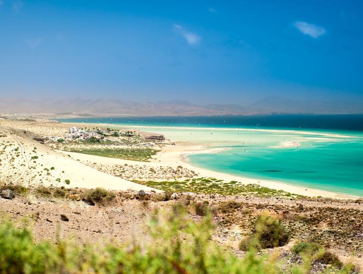 Einst verbannten Spaniens Machthaber unliebsame Zeitgenossen hierher. Der berühmteste von ihnen, der Dichter Miguel de Unamuno, nannte die Insel „ein nacktes, skeletthaftes, karges Land aus nichts als Knochen“ – aber eben deswegen auch eine „Oase in der Wüste der Zivilisation“ und „ein Land, das eine ermüdete Seele zu stählen vermag“. Nun denn, dieses ärmlich-schlichte Eiland mit seinen bescheidenen Dörfern, einst ein Hungerleider unter den Kanaren, ist heute mehr Oase denn je, und das Stählen der Seele erlebt hier jeder Erholungsbedürftige, der sich auf das einlässt, was ihm die Insel gewissermaßen zu Füßen legt. All die Sonnenhungrigen und Surfbegeisterten, die heute freiwillig hergeflogen kommen, schätzen ebendies an Fuerteventura: die Urwüchsigkeit, die auf Sand, Stein und Strauchwerk reduzierte Landschaft inmitten des Ozeans, die herbe Symphonie aus fast weißem Strand, blauem Himmel, blaugrünem Meer, braungelber Steppe und vielfarbigem Gestein. Nichts ist hier von der üppigen Vegetation La Palmas oder der landschaftlichen Vielfalt Teneriffas zu erahnen, nichts vom quirligen Stadtleben auf Gran Canaria. Bis heute zählt Fuerteventura mit nur 75 Einwohnern pro Quadratkilometer zu den am dünnsten besiedelten Kanarischen Inseln.