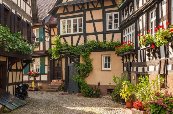 In der Engelgasse sind die Fachwerkhäuschen winkelig und ineinander verschachtelt.