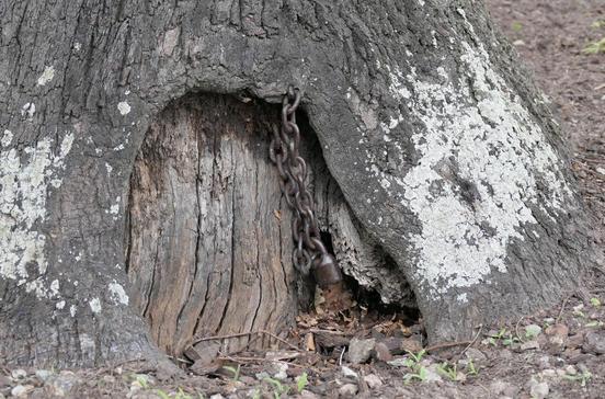 In den Stamm der knapp 200 Jahre alten Eiche sind Teile einer alten Eisenkette eingewachsen. Hier sollen früher Sklavenversteigerungen stattgefunden haben.