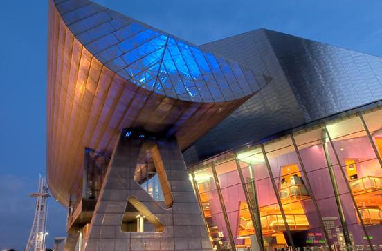 Das hypermoderne Kulturzentrum mit zwei Galerien, zwei Theatern, Restaurants und Bars thront wie ein Riesendampfer über den Docks. Der Komplex ist nach dem Künstler L. S. Lowry (1887-1976) benannt, der Industrieszenen aus der Gegend um Manchester malte.
