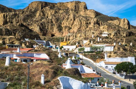 Weiße Schornsteine ragen aus brauner Landschaft, Häuserfassaden kleben an Felsen: An die 1300 Höhlenwohnungen verteilen sich über den Stadtteil Santiago in Guadix. Schon in vorrömischen Zeiten gruben sich die Menschen hier in die Erde. Heute sind die Höhlen komfortabel ausgestattet, im Schnitt 70 m2 groß und besitzen kein Fenster. Der einzige Licht- und Lufteinfall kommt durch die Tür. Sehenswert sind auch die maurische Alcazaba und die Kathedrale (15.Jh.).