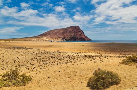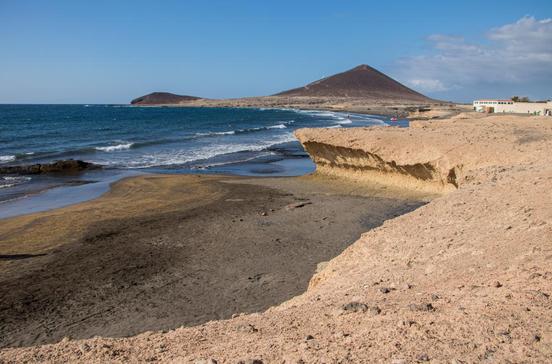 Der Vulkanfelsen Montaña Roja, der "Rote Berg", überragt den Strand Playa de la Tejita.