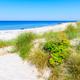 Langer, strahlend weißer Badestrand.