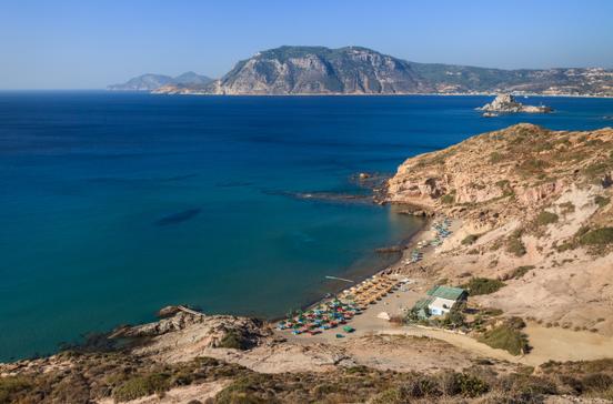 Anders baden: kein Sand, dafür ein Minifjord mit niedrigen Felsufern, eine chillige Beachbar, Liegen unter Palmen. Fürs Auge die orientalisch anmutende Kuppel eines Brunnenhauses aus italienischer Zeit. Früh zu kommen lohnt sich, denn es wird hier trotz hoher Preise sehr voll.