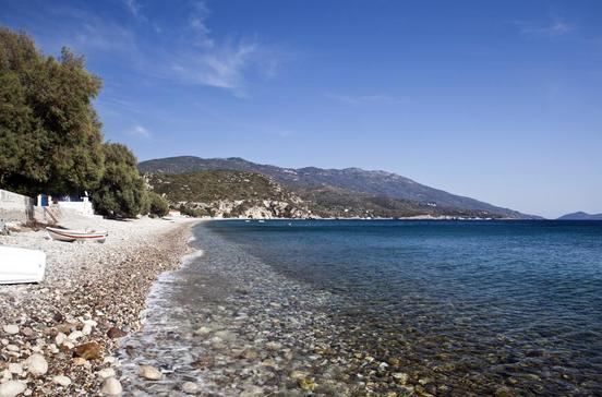Am Strand von Tsópela kann man vergessen, dass es noch etwas anderes gibt als diesen idyllischen Fleck. Kein Dorf und keine Straße sind in Sicht. Der Kiefernwald reicht bis ans Meer heran, selbst am Strand kannst du noch im Kiefernschatten liegen. Zwei kleine Buchten stehen zur Auswahl, eine mit Kies, die andere mit glatten Felsplatten. Am Kiesstrand haben die Töpfer Anna und Jánnis Stavrianoú ihren Verkaufsstand aufgeschlagen, bemalt Anna Teller, Vasen und andere Gefäße nach historischen Vorbildern. Die beiden leben von Mai bis Oktober in einem Zelt am Strand; im Winter brennen sie ihre Keramik im Bergdorf Pagóndas. Vögel zwitschern, Zikaden zirpen, draußen vor der Küste ist auf dem Inselchen Samiopoúla die Inselkirche zu erkennen. Zum Strand von Tsópela führt von der Inselrundstraße eine 6,8 km lange Piste, die nur ganz Verwegene auch mit dem PKW meistern. Von Pythagório aus gibt es auch täglich Bootsausflüge. Den amüsantesten bietet der bärtige Captain Jánnis, der am späten Nachmittag und abends stets vor seinem unübersehbaren Boot am Kai von Pythagório zu finden ist und dort Anmeldungen entgegen nimmt.
