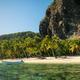Der weiße Strand fällt in einer Bucht flach in türkis leuchtendes Wasser ab.