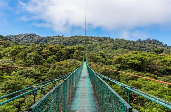 Hängebrücken verbinden sich zu einem langen Pfad durch die 40 m hohen Baumkronen des Nebelwalds. Ein auch für Kinder gefahrloser, etwa 2,5 km langer Spaziergang. Nur als geführte Tour.