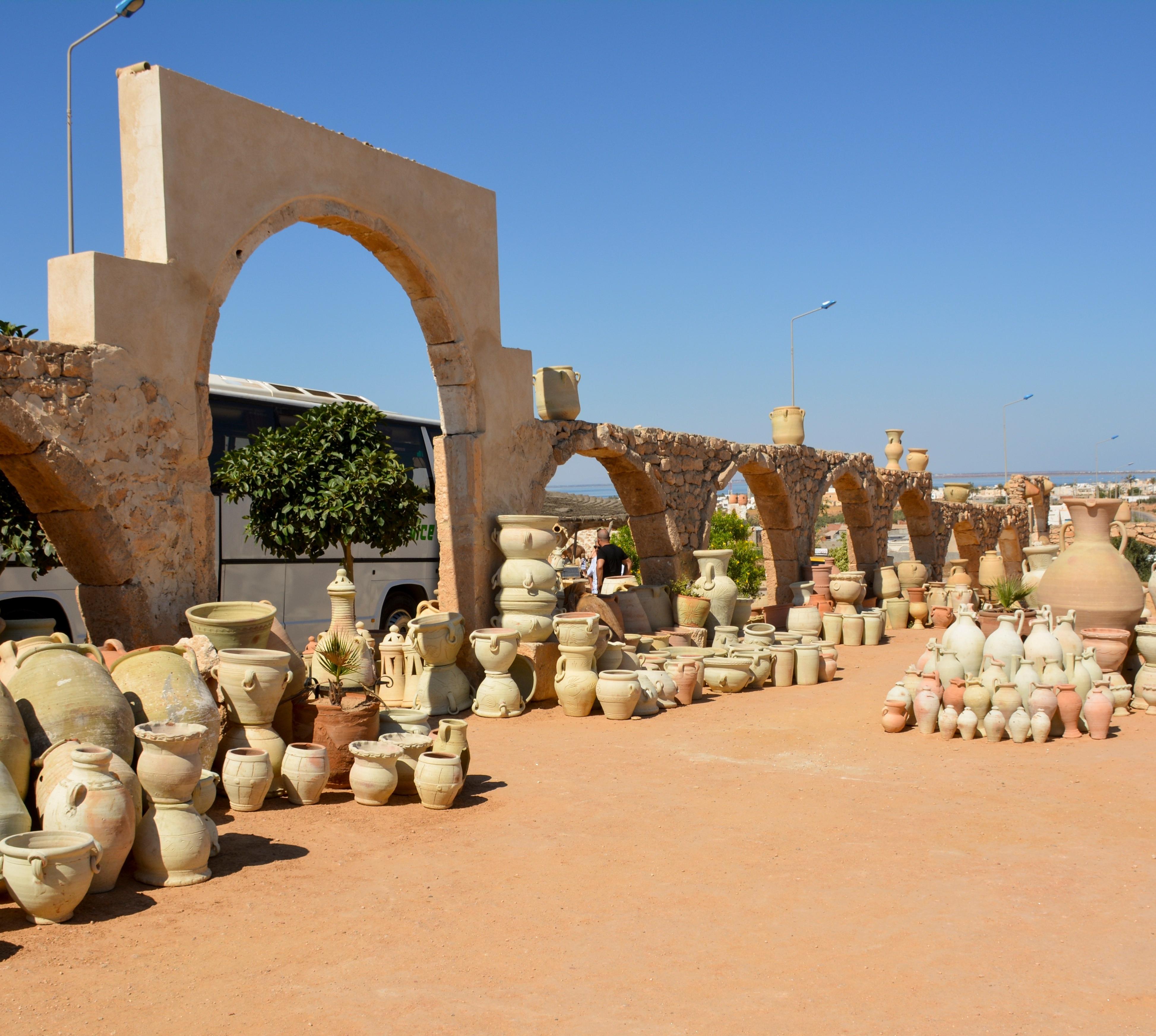 Die großen, irdenen Gefäße dienten als Vorratsbehälter und zum Transport von Wasser, Olivenöl und Wein. Im alltäglichen Gebrauch wurden sie mehr und mehr durch unzerbrechliche Plastikbehälter ersetzt. Heute setzt man daher vor allem auf den Verkauf an Touristen; diese sind allerdings mehr an glasiertem Geschirr als an den schlichten Krügen interessiert. Dazu bedarf es aufwendigerer Brennöfen, die sich nicht alle leisten können. So wird in Guellala neben eigener Produktion auch das industriell gefertigte bunte Tongeschirr aus Nabeul verkauft. | Markttage: Sonntag und Mittwochvormittag