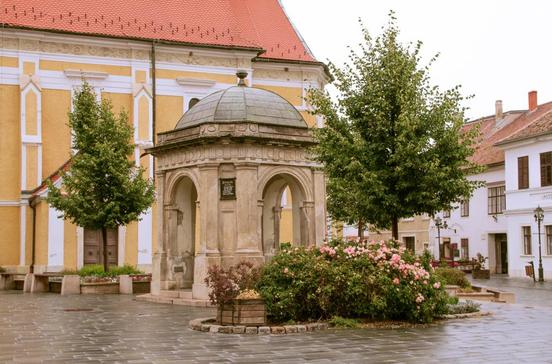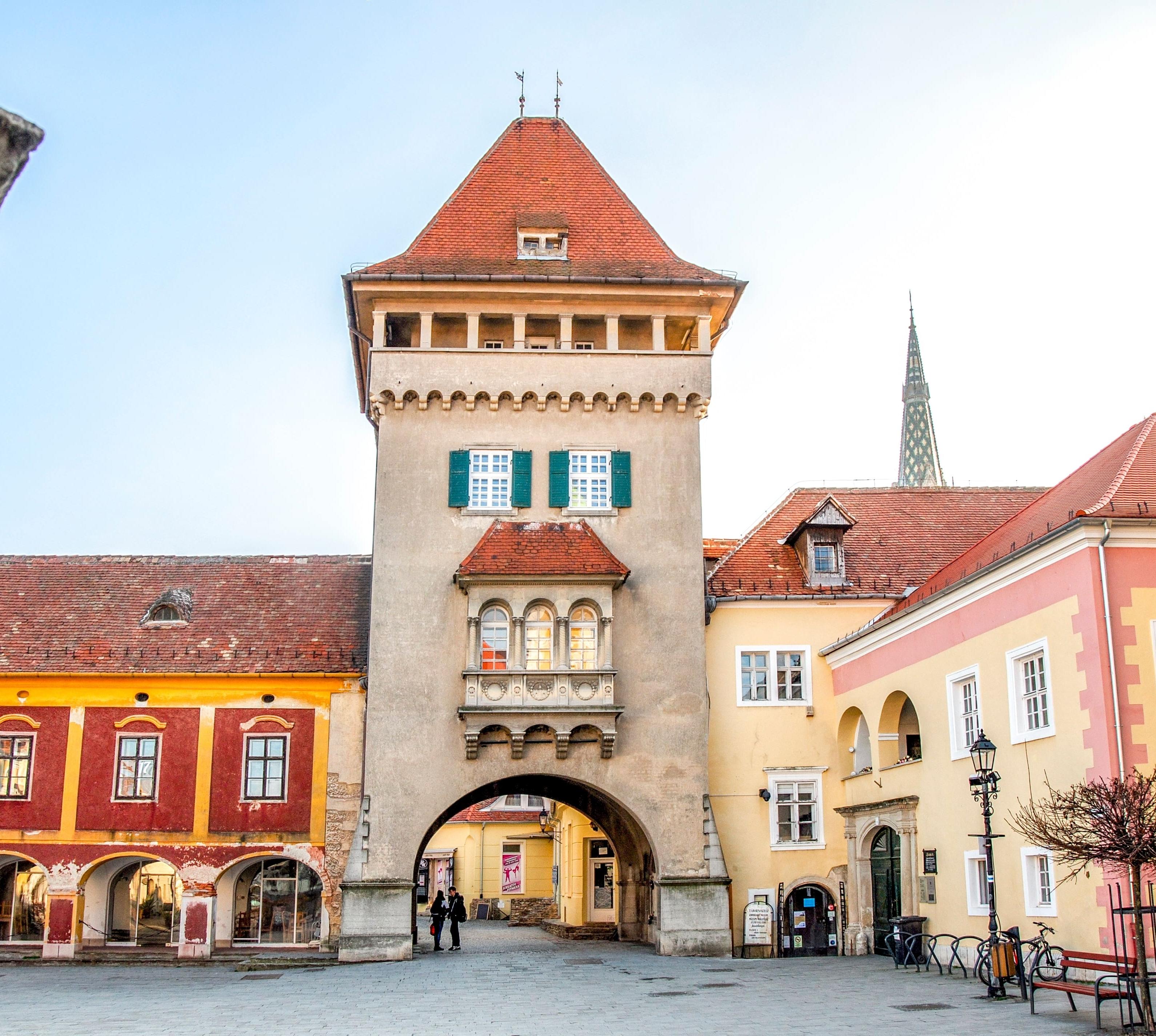 Auf dem Jurisics-Platz steht neben der gotischen Jakobskirche von 1404 die St.-Emmerich-Kirche. Das nur sechs Bankreihen kleine Kirchenschiff kontrastiert mit drei beeindruckenden Barockaltären. Das Hochaltarbild (1805) malte Stephan Dorffmeister d. J., das Tafelbild „Mariä Heimsuchung“ ist ein Werk von Franz Anton Maulbertsch. Ein Blickfang am Jurisics tér ist das Rathaus mit seiner Barockfassade.