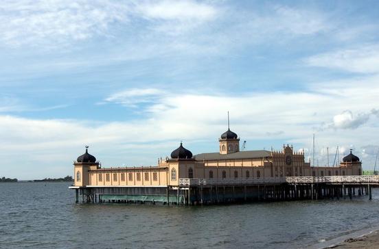 Nur über eine hölzerne Brücke ist das auf Stelzen im Wasser stehende Badehaus zu erreichen. Mit den verspielten Ornamenten erinnert das 1820 errichtete Gebäude an die orientalische Architektur. Mit zwei öffentlichen Saunen.
