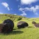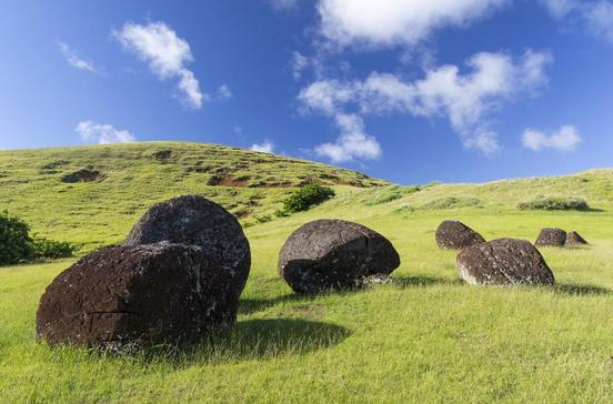 In dem einstigen Steinbruch am Hang eines Nebenvulkans des Rano Kao wurden die Kopfaufsätze der Moai aus roter Vulkanschlacke hergestellt.