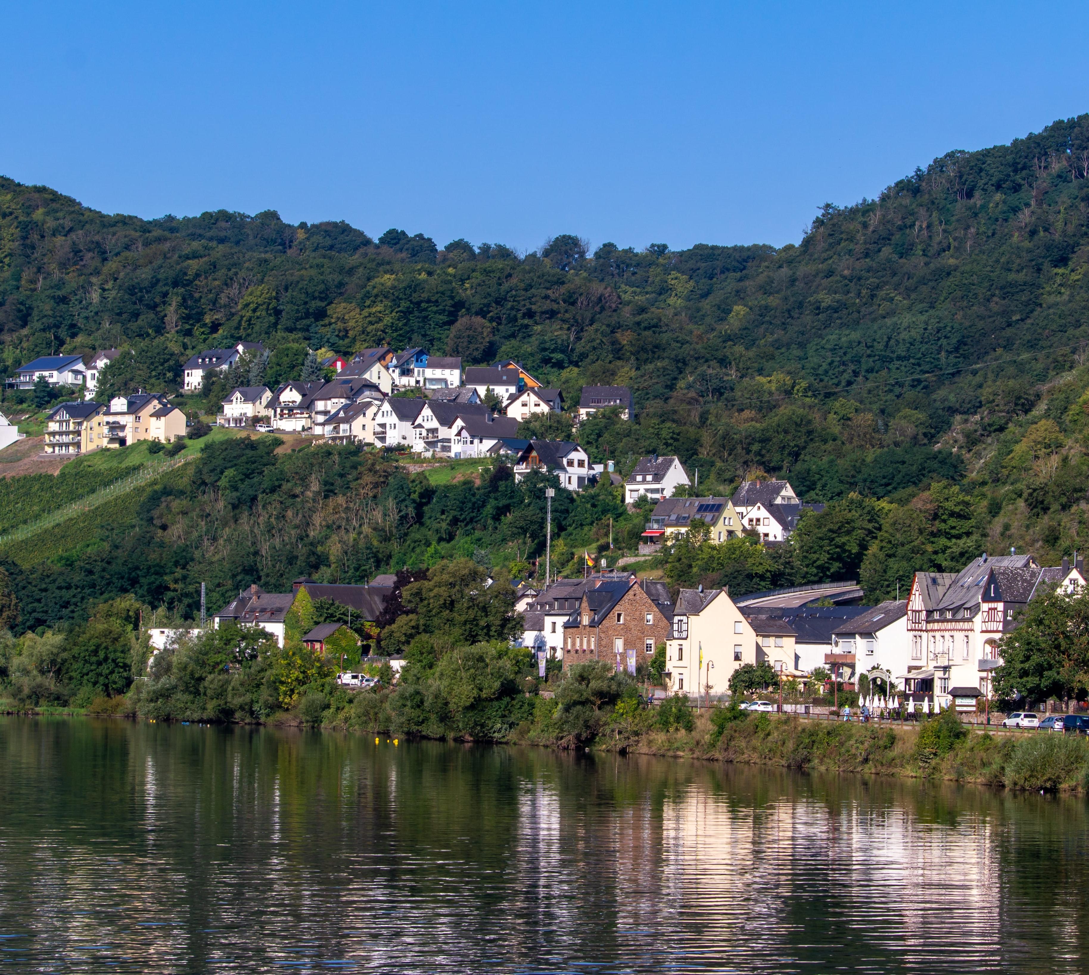 Hier ist die Mosel breit. Von den Cafés am Ufer aus betrachtet, wirkt sie wie ein See. Das Dorf (700 Ew.) war früher eine keltische Siedlung. Hoch über ihm wacht die imposante Burg Thurant. Ende des 12.Jhs. wurde sie vom Kreuzfahrer und Pfalzgrafen Heinrich auf antiken Fundamenten errichtet. Heute sind Teile von ihr Ruinen. Natürlich führt nun eine moderne Straße hinauf, aussichtsreicher und entschleunigender ist allerdings die Wanderung auf dem Moselsteig. Oben angekommen erwarten dich Giebeldächer und ein Steingarten mit barocken Skulpturen ,umringt von Blumen und Sträuchern. Sehenswerte „innere Werte“ sind Verlies, Kapelle, Jagdzimmer und Weinkeller, doch die größte Burgenattraktion ist der Weitblick in die Landschaft. Das Dorf zu Füßen der Burg zieht sich an der Uferstraße entlang. Die Reste seiner Stadtmauer samt Zoll- und Signalturm, die mittelalterlichen Höfe und andere stille Nischen zu erkunden lohnt sich. Am Ortsrand wird im familiären und liebevoll geführten Landhaus Zimmermann bodenständige Küche serviert. Dank hausgemachter Gemüsemaultaschen müssen selbst Veganer nicht hungrig bleiben.
