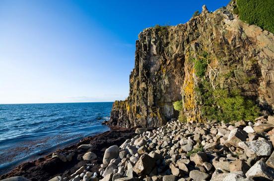 Ein wilder Küstenabschnitt, eine bizarre Felsformation und eine Höhle. Schon nach wenigen Metern Fußweg wird klar: Das Panorama ist der Hammer, bei gutem Wetter kann man sogar hinüber nach Schweden schauen. Muskelkater ist aber programmiert, denn jetzt geht es 150 Stufen über eine Holztreppe hinab zur „Kapelle“. Erwarte aber bloß keinen Steinbau. Die sogenannte Kapelle ist ein Ensemble von Felsen, die eine Art Kanzel darstellen. Laut der Legende soll der irische Geistliche Jon hier gelebt und zu den Bornholmer Fischern gepredigt haben. Der Weg führt durch das Brutgebiet der Goldammern. Während der Brutzeit von April bis August tragen die Männchen ein prachtvolles gelbes Federkleid – vor dem Hintergrund der grauen Felsen ein exotisches Farbenspiel. Folg in jedem Fall noch dem Küstenpfad in nördlicher Richtung bis zu den Klippen von Hvidkleven. Hier wachsen Anemonen und Orchideen, üppig wuchern grüne Farne und die Aussicht ist phantastisch. Bei stürmischem Wetter ein echter Nervenkitzel! Dann schlagen die schäumenden, meterhohen Wellen mit voller Wucht gegen die Felsen.