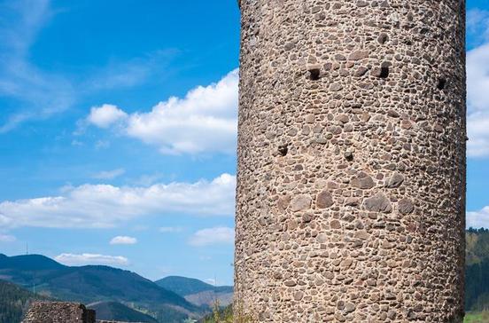 Die Ruine dieser Burg thront noch heute auf einem vorspringenden Bergrücken über dem Ort. Der Turm ist frei zugänglich.