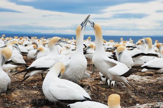 Die ersten Jungen des neuseeländischen Tölpels schlüpfen Anfang Dezember. Touristen und Ornithologen, die sich zwischen November und Juni auf den Weg zum 15 km südöstlich von Napier gelegenen Kap machen, haben sich an die hier brütenden Vögel gewöhnt.