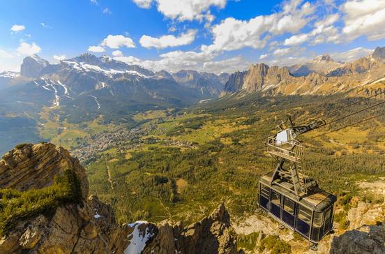 Einmalig ist die Fahrt mit dem „Freccia del Cielo“ (Himmelspfeil) von Cortina bei atemberaubender Steillage in drei Abschnitten auf den mächtigen Felszacken der Tofana di Mezzo (3244 m): Das Panorama ist unbeschreiblich.