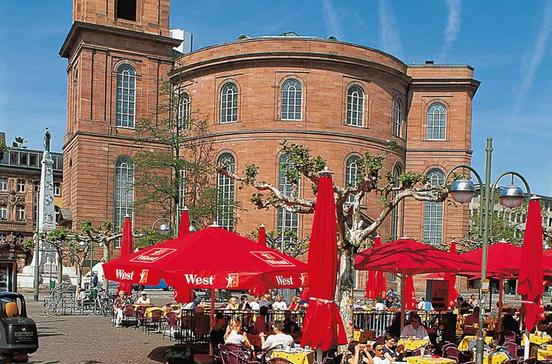 Kein Gotteshaus, sondern ein politisches Denkmal: als Stätte der ersten Deutschen Nationalversammlung 1848.Fast 800 Parlamentarier kamen hier, an der Stelle des einstigen Barfüßerklosters zusammen (wo u. a. der berühmte Maler Adam Elsheimer getauft wurde), um Deutschland eine liberale Verfassung zu geben. Ein Monumentalfries (32 m) des Berliner Malers Johannes Grützke erinnert seit 1991 mit historischen, zeitgenössischen, allegorischen und anekdotischen Szenen an den Einzug der Volksvertreter in die 1833 geweihte Saalkirche. Nach dem Zweiten Weltkrieg nicht originalgetreu rekonstruiert und Ende der 80er-Jahre erneut verändert, wird die Paulskirche heute v. a. für wichtige nationale Ehrungen genutzt: die Verleihung des Goethepreises z. B. oder des Friedenspreises des Deutschen Buchhandels. Im nüchternen Plenarsaal hängen die Flaggen aller Bundesländer.