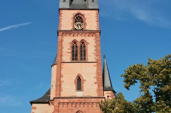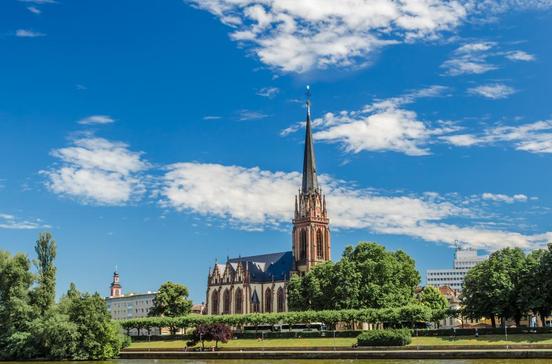 Der neugotische Hallenbau entstand 1880 auf den Fundamenten der mittelalterlichen Kapelle des Hospitals der Deutschordensritter. Sein 81 m hoher Turm war damals zweithöchstes Gebäude in Frankfurt nach jenem des Doms, dessen Formensprache er zitiert. Fenstermotive, Geläut und Orgel stammen aus den 1950er-Jahren. Für ihre Musiktradition berühmt, finden hier regelmäßig Kantatengottesdienste, Abendmusiken und Orgelkonzerte für meist kleines Eintrittsgeld statt.