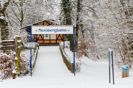 Etwa vier Minuten dauert die Fahrt auf Wiesbadens Hausberg: Die Nerobergbahn ist Europas einzige Drahtseil-Zahnstangen- Bahn, die mittels Wasserballast angetrieben wird. 438 m liegen zwischen Tal- und Bergstation mit einem Höhenunterschied von 83 m. Ein über 100 m langer Viadukt erstreckt sich in fünf Gewölben über das Nerotal. Ein gewaltiger Wassertank an der Bergstation fasst 370 000 l; je nach Anzahl der zu befördernden Personen wird der Wagen an der Bergstation mit Wasser betankt. Während er nach unten fährt, zieht er den anderen Wagen nach oben. An der Talstation angelangt, wird das Wasser abgelassen und wieder auf den Neroberg gepumpt. Eine kleine Wanderung (2,7 km) durch den Waldabhang führt zurück zur Talstation.