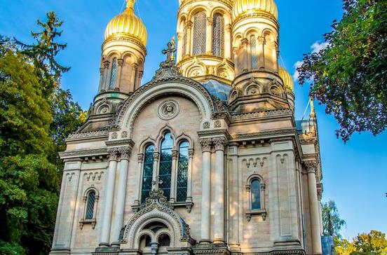 An prominenter Stelle hoch über der Stadt ließ Herzog Adolph für seine Gattin Elisabeth Michailovna diese Kapelle errichten: Die Tochter eines russischen Großfürsten war bei der Geburt ihres ersten Kindes mit nur 19 Jahren gestorben. Weithin sichtbar leuchten die fünf goldenen Kuppeln der Grabeskirche über dem Neroberg. Fast sechs Jahre (1849– 1855) dauerte die Errichtung der Kapelle im russisch-byzantinischen Stil. Im Kircheninneren ist die reiche Marmorverkleidung auffällig.