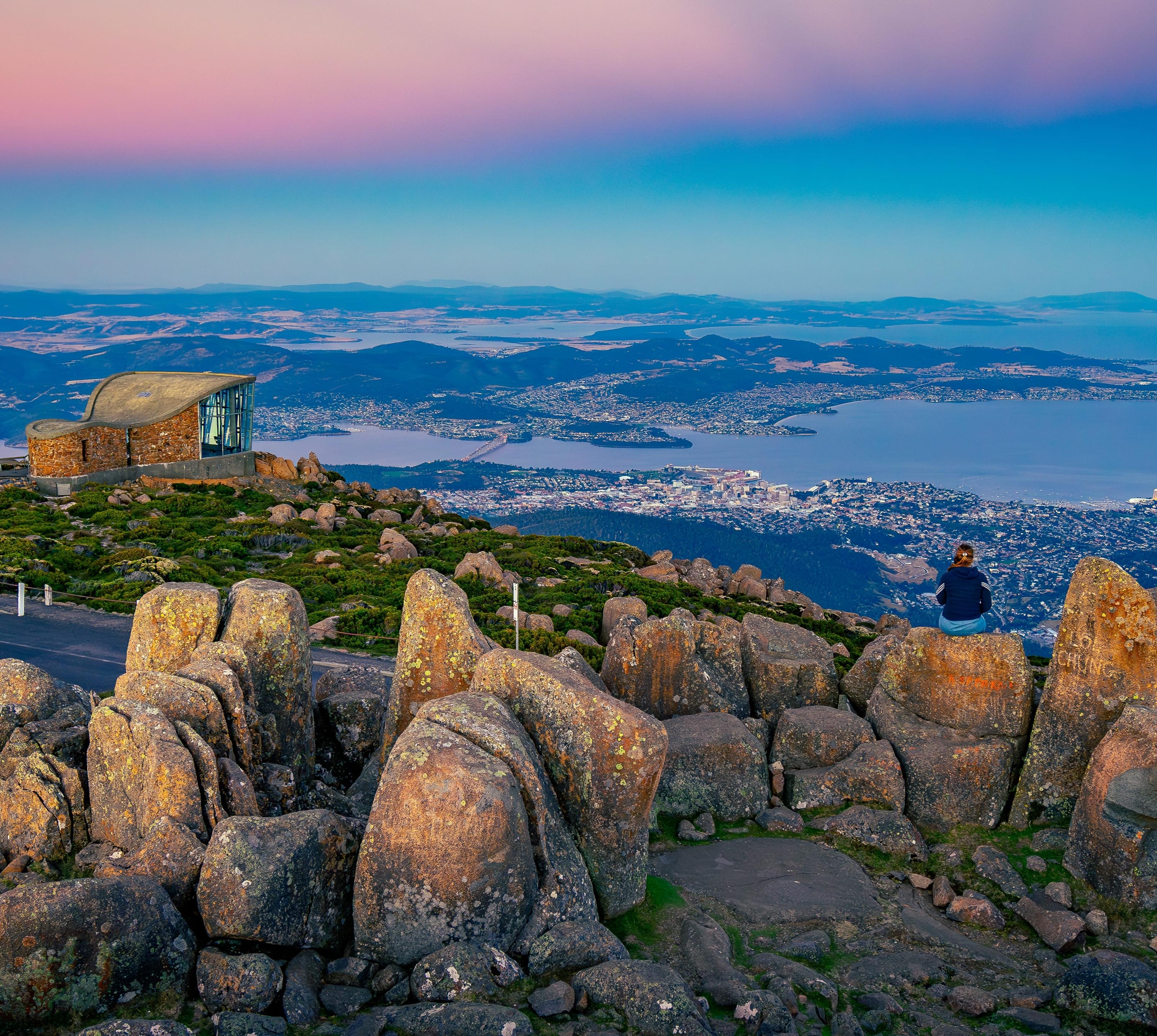 Im Zentrum des Geschehens liegt der bildhübsche Naturhafen Sullivans Cove. An klaren Tagen ist die Aussicht vom Mount Wellington unübertrefflich.