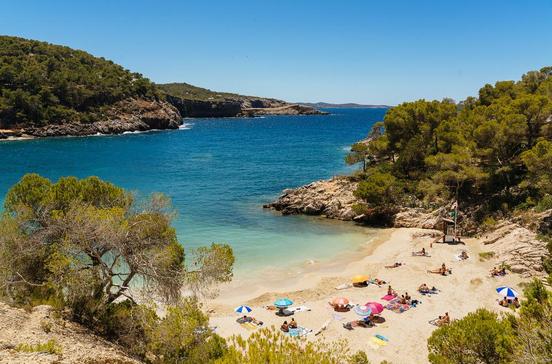 Lasse dich nicht von den mit Apartmentblocks zubetonierten Flanken abschrecken, die Cala Tarida lohnt einen Abstecher. Ins Bild gehören schöne Sandabschnitte und Felsplatten, im und am Wasser kannst du Kontakte knüpfen. Auch Familien mit Kindern suchen den Strand gerne auf, zumal das Wasser hier flach abfällt.