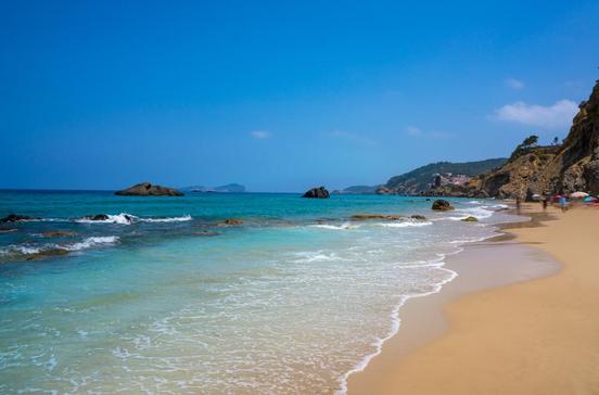 Der Strand ist das feinsandige Aushängeschild des Südens, gut kombinierbar mit der Platja de ses Salines. Die Anfahrt führt durch das weitflächige Gebiet der Salinen und erlaubt den Blick zurück auf die Hügelkulisse des Inlands. Endpunkt ist ein großer Parkplatz, von dort geht es über die Dünen und an den Nacktbadestrand. Hier befindet sich ein beliebter, von Mai bis Oktober betriebener Restauranttreff, als Zugabe gibt es den schönen Blick hinüber zur Dalt Vila. Südwärts zieht sich der Strand an Felsenplatten vorbei auf die Landspitze Punta de ses Portes zu - eine lohnende Wanderung an der Küste entlang. Weithin sichtbar thront dort die Torre de ses Portes, ein Wachturm des 16./17.Jhs.