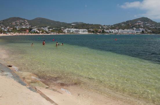 Östlicher Hausstrand Eivissas, rasch zu erreichen ab der Marina Botafoc. Der tiefe, geschützte Buchteinschnitt verspricht ruhiges Wasser und steht deshalb bei Familien mit Kindern hoch im Kurs. Nahe dem Flotante erleichtern Holzstege den Streifzug am Sandband der Platja de Talamanca entlang. Später gehen die Planken in eine Promenade über. Hinter den Kiefernhainen, an den Steinplatten Richtung Cap Martinet, ist Ende Gelände.