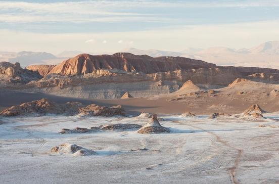 Man fährt durch die steinig-staubige, graugelbe, manchmal rötlich glitzernde Atacama-Wüste, in der Luftspiegelungen geisterhafte Seen entstehen lassen. Bald zeigen sich die schneebedeckte Andenkette im Osten und voraus die glänzende Fläche des Salzsees von Atacama.