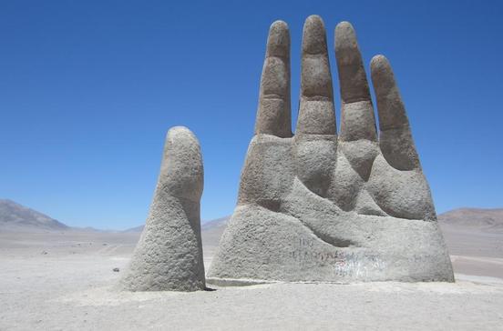 Diese 11 m hohe Skulptur aus Zement und Eisen wurde 1992 vom chilenischen Bildhauer Mario Irarrázabal auf einer Höhe von 1000 m erschaffen. Die Bedeutung der riesigen Hand hat der Künstler zur Interpretation freigegeben: Für manche ist sie ist ein Denkmal für die Opfer der chilenischen Militärdiktatur, die in Massengräbern in der Wüste verscharrt wurden, für andere ein Mahnmal für Umweltsünden, damit die Erde nicht komplett zur Wüste wird.