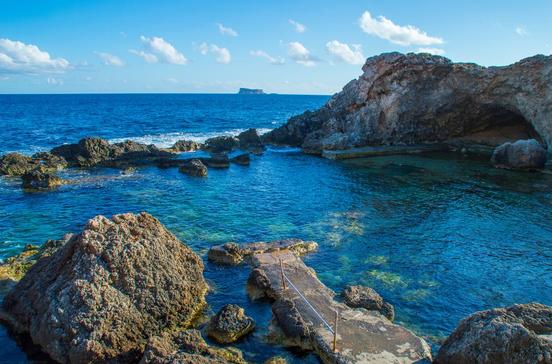 Die winzige Bucht (Ar Lapsi gesprochen) ist ein kurioser Badeplatz – mit ein paar Fischerbooten im Sommer, Sonnenliegeplätzen auf Felsvorsprüngen und einigen schattigen Sandflecken für maximal 20 Personen. Und die sind schnell voll. Taucher gehen hier im Neoprenanzug ins Wasser, Schnorchler mit Maske und Flossen – zu entdecken gibt es immer was. Dazu eine simple Cafeteria, die urige Fischtaverne Carmen‘s Bar und ein super Restaurant: das Dive In. Auf seiner Terrasse können bis zu 36 Gäste wie auf dem Bug eines Schiffs mit Kurs Hohe See sitzen – besonders toll zum Sonnenuntergang und unterm Sternenhimmel.