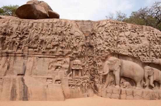 Das riesige (etwa 30 mal 12 m) Relief ist in zwei mächtige Felsen gemeißelt. Der Spalt zwischen ihnen wurde ins Bild einbezogen: Er stellt den Ganges dar, der vom Himmel auf das dürstende Indien herabgeschickt wurde. Alle Götter- und Menschengestalten der meisterhaften Komposition beziehen sich auf dieses Ereignis. An die 400 Figuren - Affen- und Elefantengruppen, Götter, Menschen- sind zu sehen. Den Namen hat das Relief daher, dass man glaubte, auch Arjuna aus dem Epos Mahabharatha sei dargestellt, wie er die Götter um eine unschlagbare Waffe bittet.