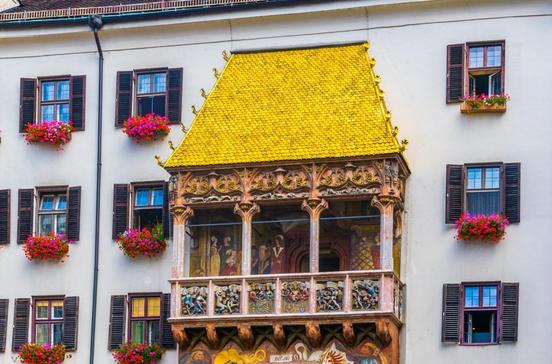 Der Prunkerker mit den 2657 vergoldeten Schindeln ist das Wahrzeichen Innsbrucks und die wichtigste Sehenswürdigkeit der Stadt. Kaiser Maximilian I. hatte sich die kaiserliche Loge um 1500 bauen lassen, um bei Turnieren und Spielfesten auf dem Stadtplatz in der ersten Reihe zu sitzen. Sich selbst ließ er in der Mitte der Balustrade verewigen: links mit seinen zwei Frauen, Bianca Maria Sforza (mit Apfel) und Maria von Burgund, rechts zwischen Staatskanzler und Hofnarr. Im Gebäude, 1420 als Residenz der Tiroler Landesfürsten gebaut, befinden sich heute das Standesamt und das Museum Goldenes Dachl.