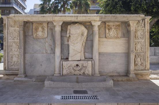 Dieses Wahrzeichen Iráklios wurde 1628 vom venezianischen Statthalter Francesco Morosíni gestiftet, um die Wasserversorgung der Stadt zu verbessern. Unter Glasplatten vor dem Brunnen sind Reste der mittelalterlichen Wasserzuleitung zu sehen.