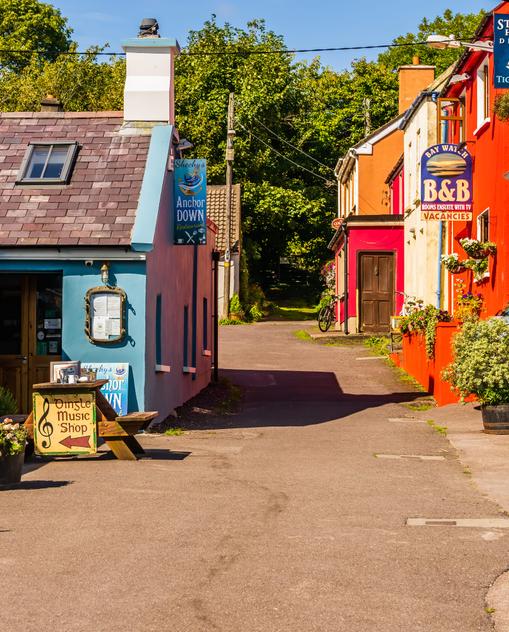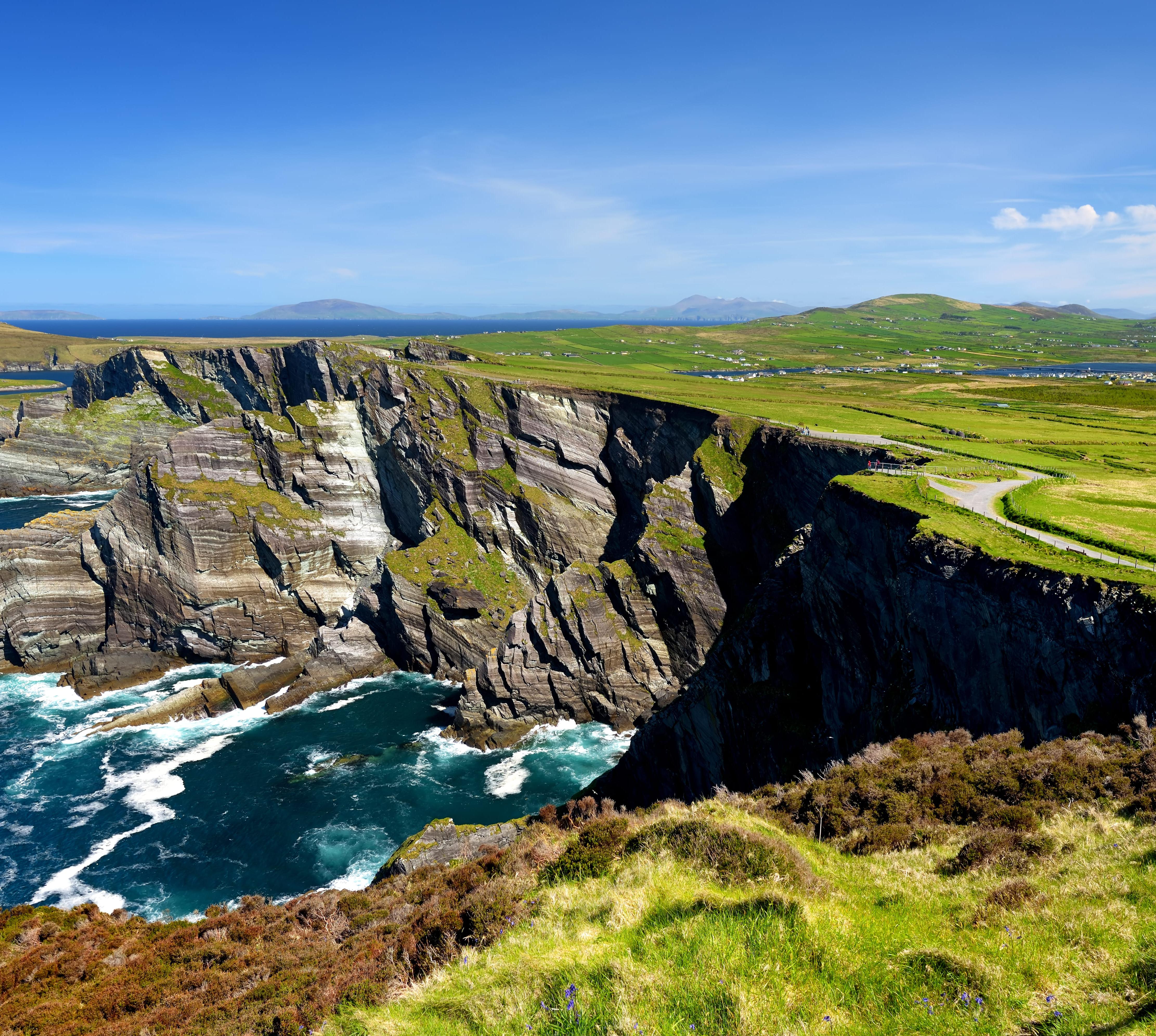 Irland wie aus dem Bilderbuch, das Meer in Sichtweite: Dörfer mit kunterbunten Cottages und reetgedeckten Pubs, davor Tische in der Sonne. Üppig wuchernde Rhododendren und von Fuchsienhecken gesäumte Landstraßen. Hügel, Berge und Täler, sattgrüne Weiden, auf denen Kühe grasen. Schafherden, geleitet von zotteligen Hunden, versperren auf engen Landstraßen schon mal die Weiterfahrt. Wilde, windumtoste Steilküste, die Luft salzig-frisch, belebend wie ein starker Kaffee.