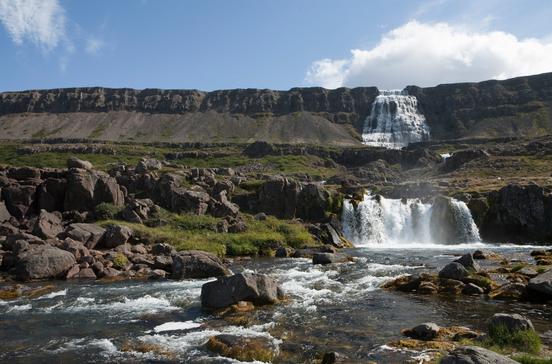 Der wohl schönste Wasserfall Islands ist auch bekannt als Fjallfoss. In mehreren Kaskaden stürzen die Wassermassen fächerförmig 100 m tief. Direkt darunter liegen fünf weitere Wasserfälle, jeder von eigenem Reiz. Den besten Blick auf dieses Wasserensemble hat man von der Küste. Dynjandi ist ein geschütztes Naturmonument.