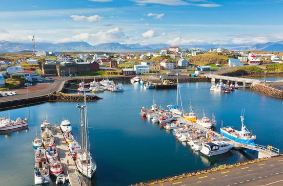 Diese vorgelagerte Insel ist mit der Stadt verbunden und schützt den Hafen. Von ihr hat man einen guten Blick auf die Inselwelt im Fjord Breiðafjörður.