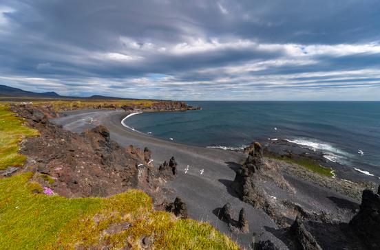 Doch auch die Küste zu Füßen des Vulkans ist bezaubernd: Ganz im Süden ragen die Felstürme Lóndrangar aus dem Meer empor, bewohnt von tausenden Seevögeln; im Westen liegt die Bucht Dritvík, einst eine wichtige Fischfangstation, heute sind nur einige Ruinen zu sehen. Der schwarze Lavakieselstrand von Djúpalónssandur ist allein schon eine Attraktion.